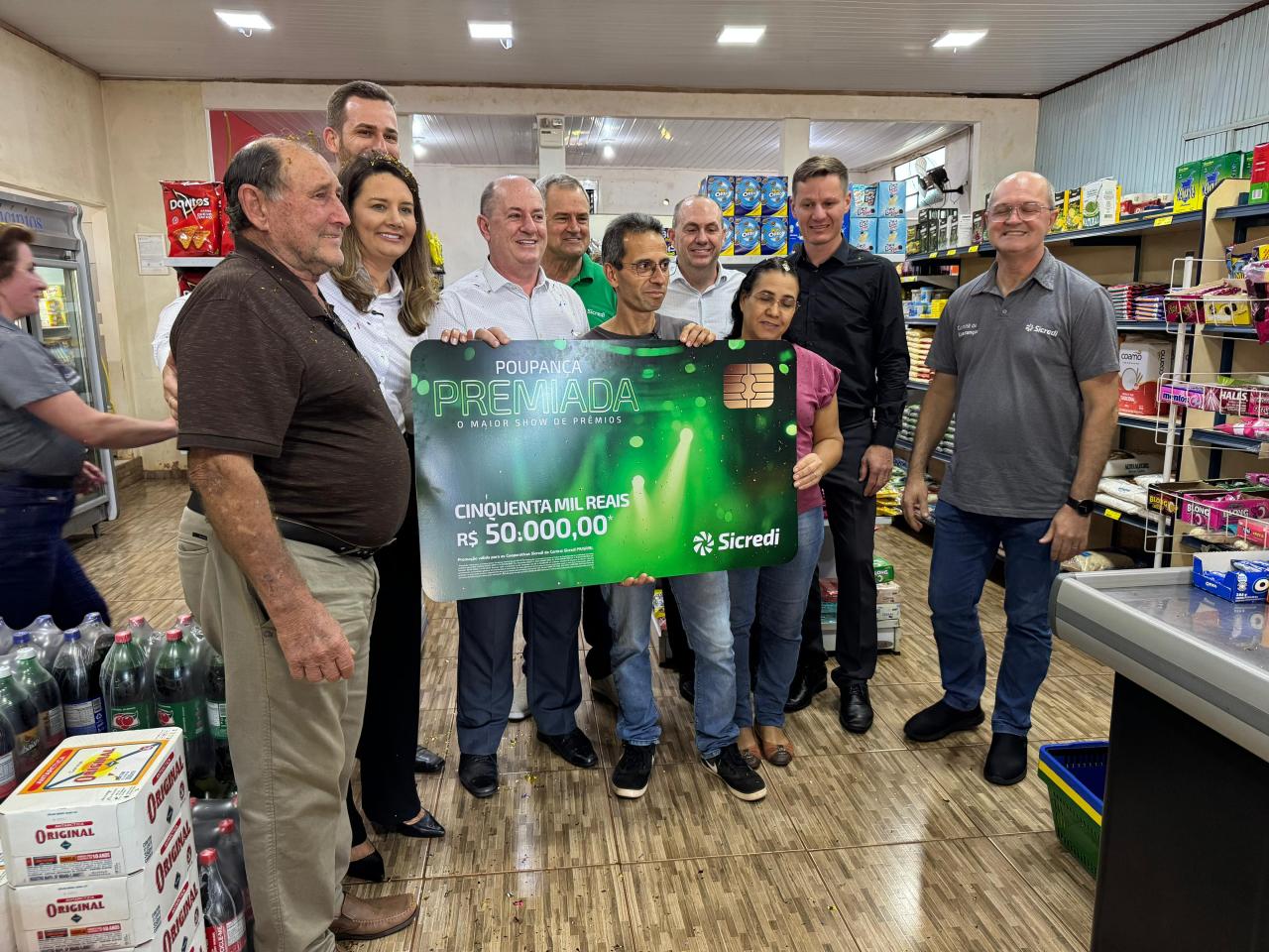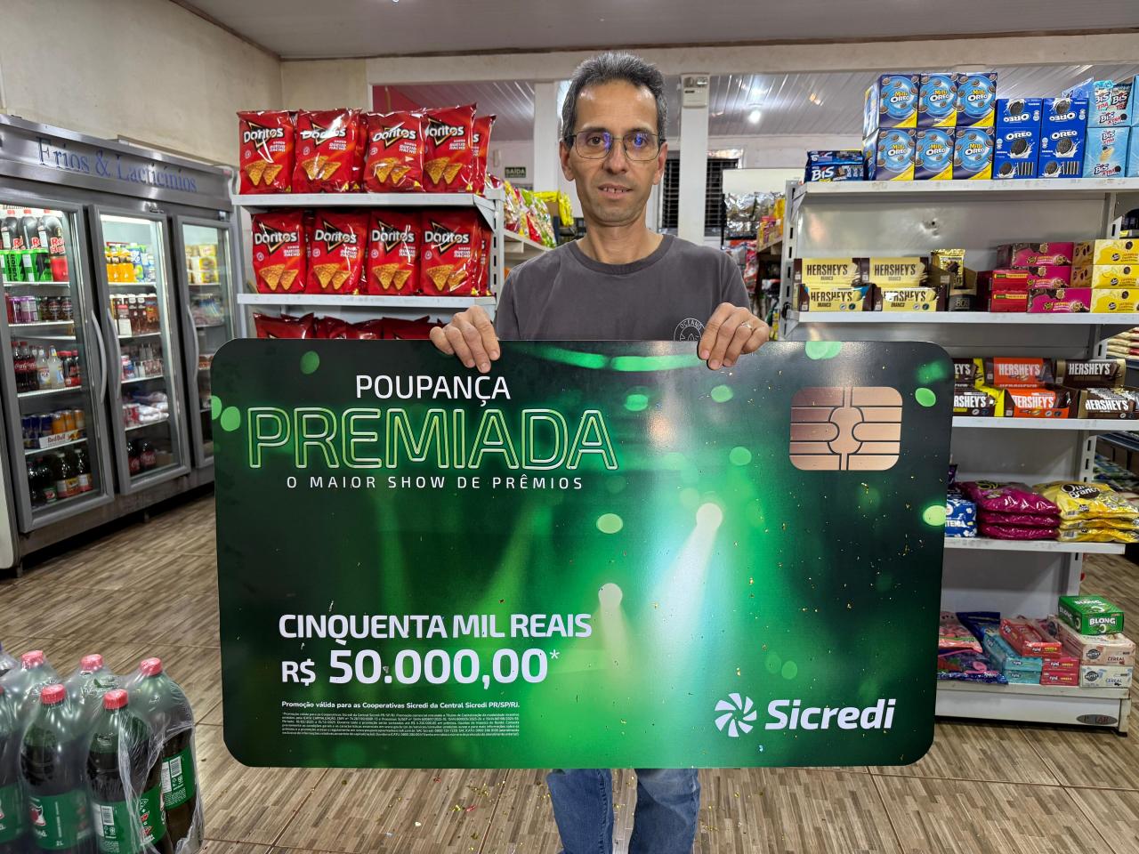 Seu Ademar da Silva é empresário e possui uma mercearia no distrito de Vila Celeste. Ao receber a notícia, se emocionou, quase não acreditando no tamanho do cheque entregue em suas mãos. “Estou muito feliz. Pela primeira vez recebo um presente igual a este. Obrigado ao Sicredi pela parceria, principalmente a toda equipe que nos atende muito bem e pelo suporte. O dinheiro vem em boa hora”, detalha o sortudo.