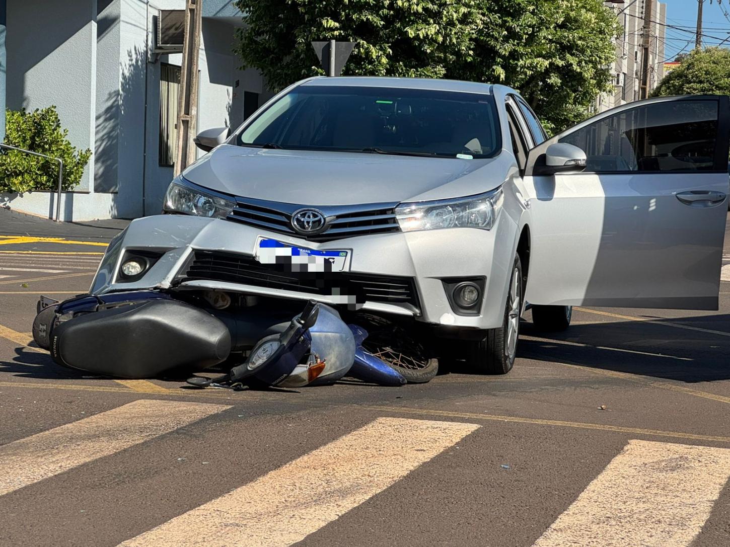 Um acidente de trânsito envolvendo um veículo Corolla e uma Honda Biz foi registrado na manhã desta sexta-feira (24), no cruzamento das ruas Paraguai e Brasilia, no centro de Santa Helena.