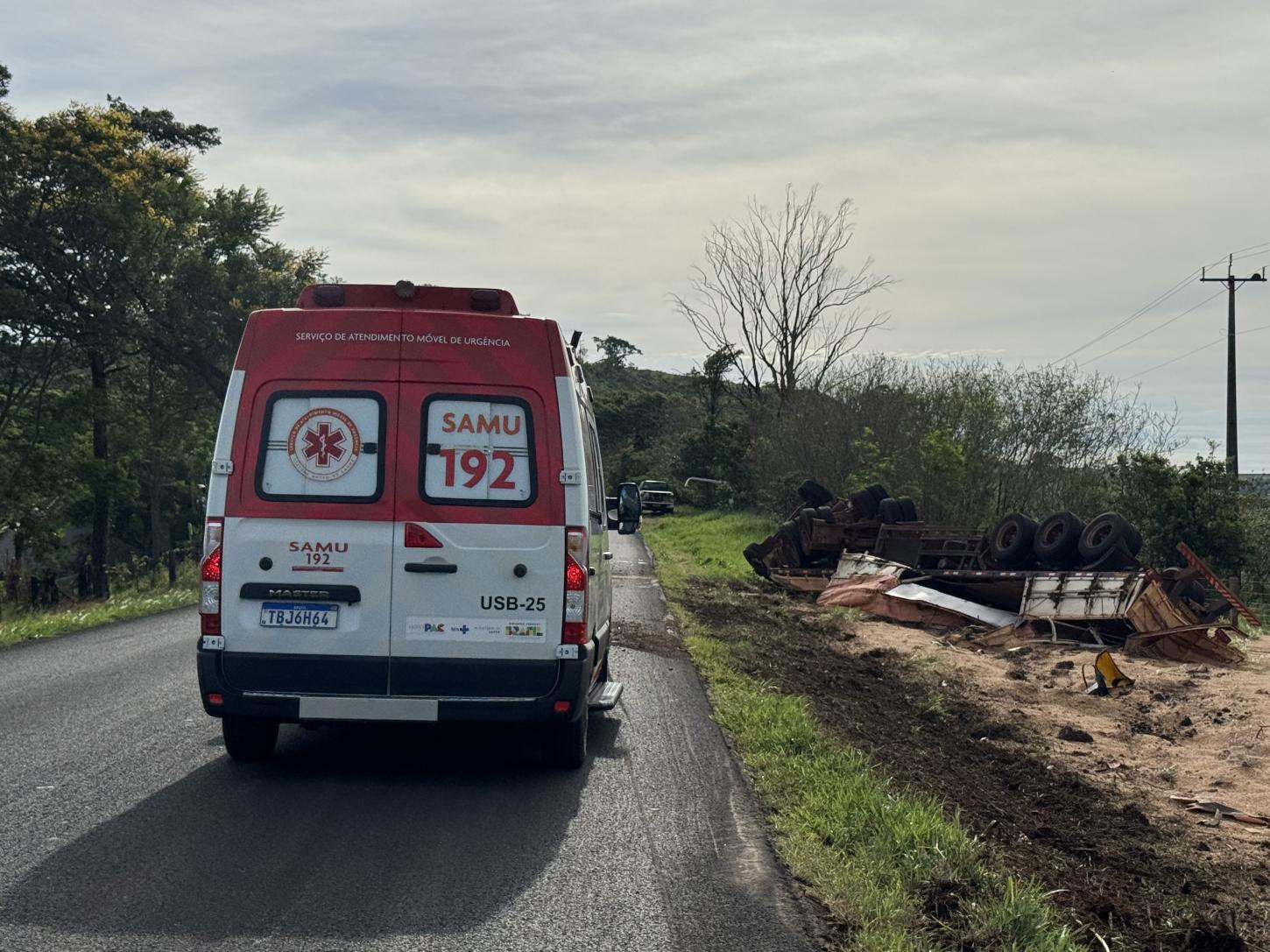 Um tombamento de caminhão foi registrado na manhã desta segunda-feira (22), na rodovia PR 488, em Diamante do Oeste.