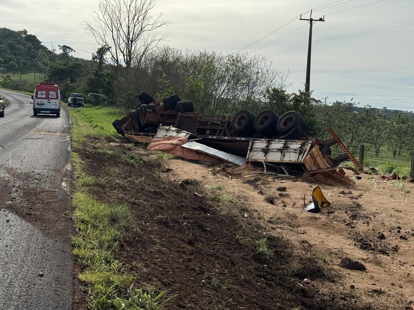 O caminhão, carregado com grãos de soja, tombou após o motorista perder o controle em uma curva acentuada. O veículo desceu um barranco e a carga ficou espalhada sobre a lateral da pista.