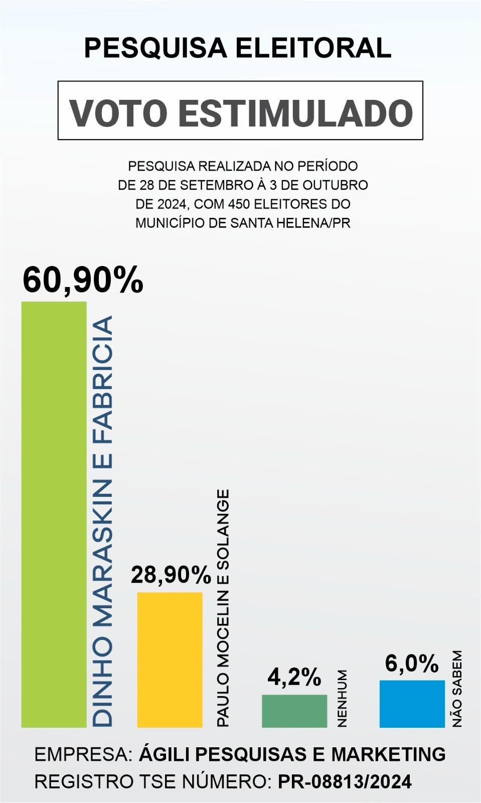 Uma pesquisa eleitoral realizada pela Ágili Pesquisas é Marketing, de 28 de setembro à 3 de outubro de 2024, revela um cenário amplamente favorável para a chapa Dinho e Fabricia na disputa pela prefeitura de Santa Helena.