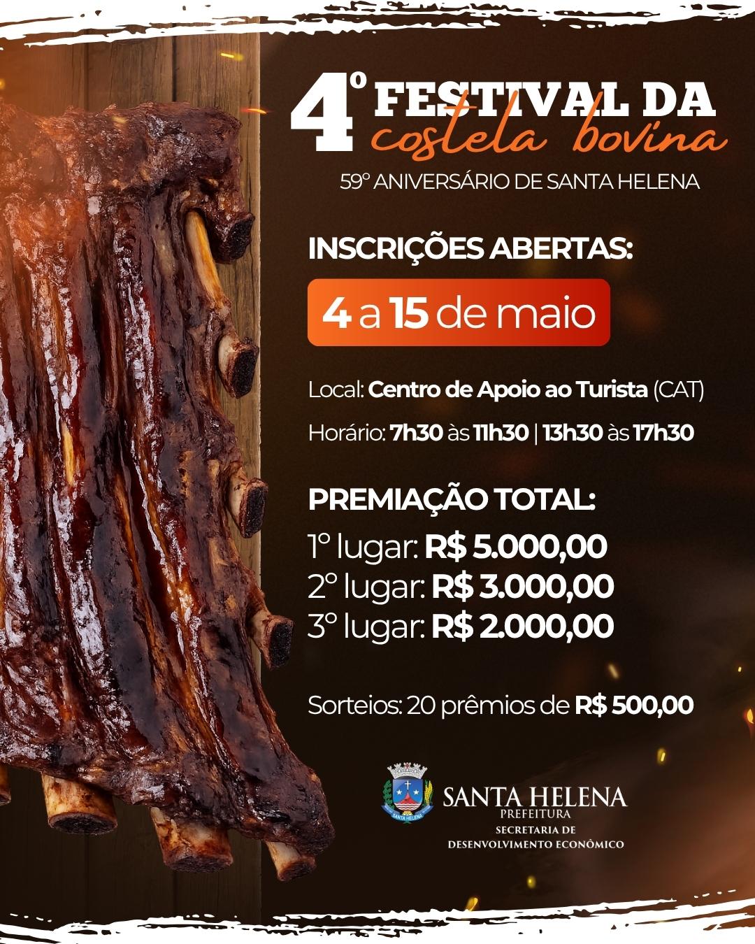 O Município de Santa Helena, por meio da Secretaria Municipal de Desenvolvimento Econômico, inicia na próxima segunda-feira (4) o período de inscrições para a 4ª Edição do Festival da Costela Bovina. O evento faz parte das celebrações do 59º Aniversário do Município e será realizado no dia 24 de maio, no Balneário Municipal.