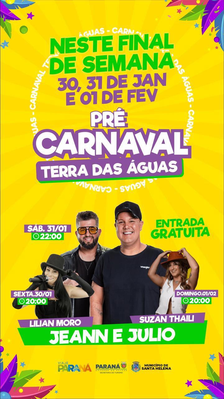Nos dias 30 e 31 de janeiro e 01 de fevereiro, Santa Helena recebe mais uma programação especial de Pré-Carnaval e Verão Maior Paraná – Costa Oeste, no Balneário Terra das Águas, com muita música, lazer e esporte para toda a família.