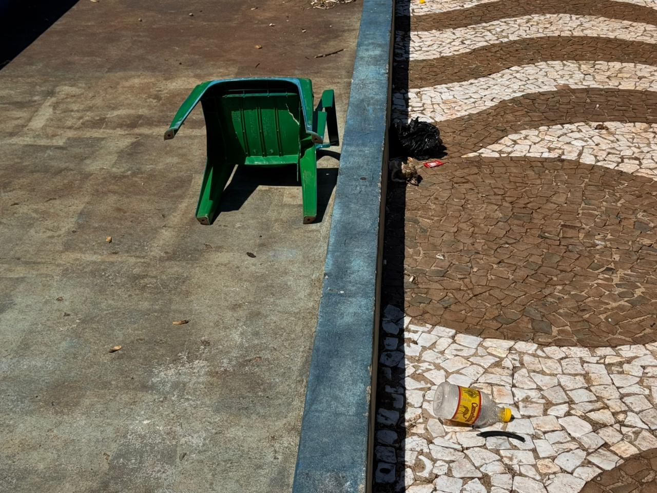 De acordo com as informações repassadas, o espaço amanheceu com grande quantidade de lixo espalhado pelo chão. Em sua maioria, eram restos de comida armazenados em potes de marmitex e diversas garrafas PETs de cachaça, além de outros resíduos descartados de forma irregular.