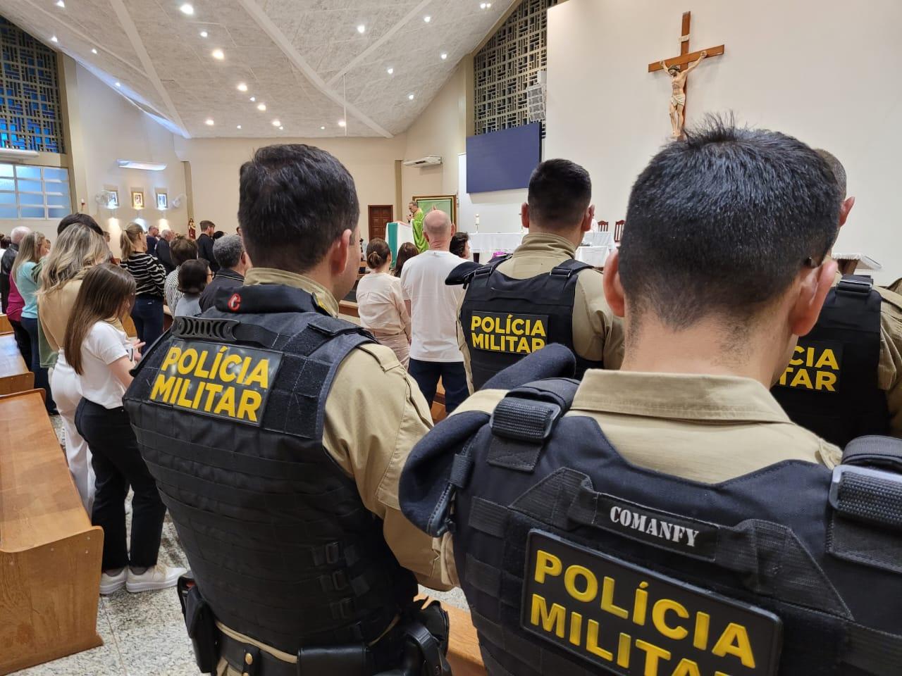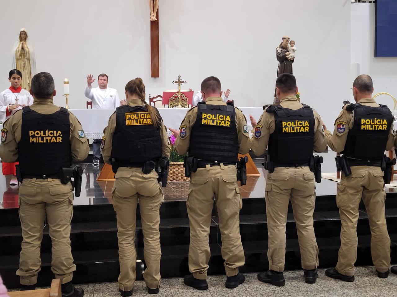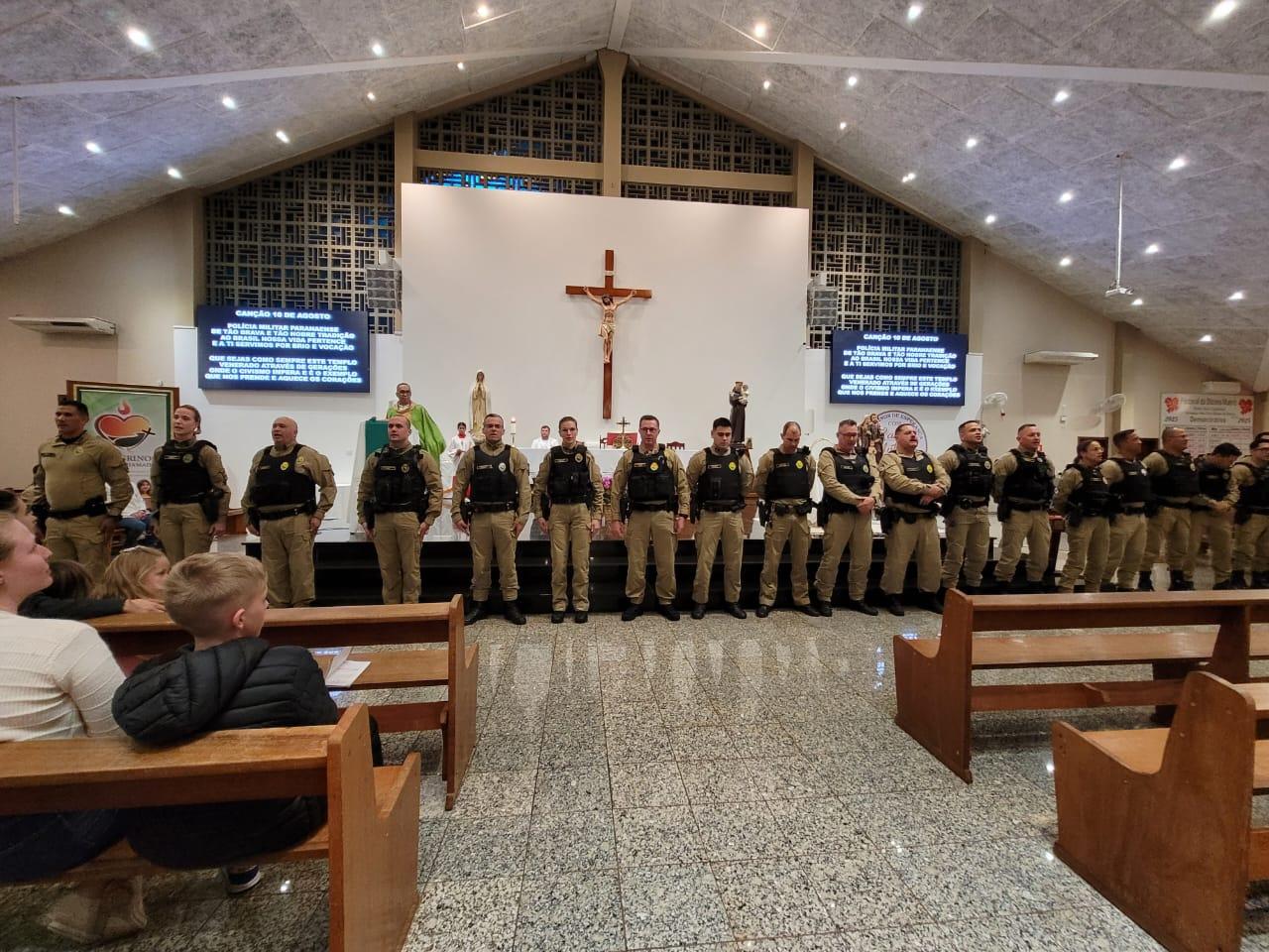 A cerimônia contou com a presença do Major Cesar, subcomandante do 19º Batalhão, da 1ª Tenente Karina Kraulich e de policiais militares da 3ª Companhia. Durante a missa, o padre Marco conduziu um momento de agradecimento à instituição, destacando a importância do trabalho da Polícia Militar na proteção da sociedade e o compromisso diário dos profissionais da segurança pública.