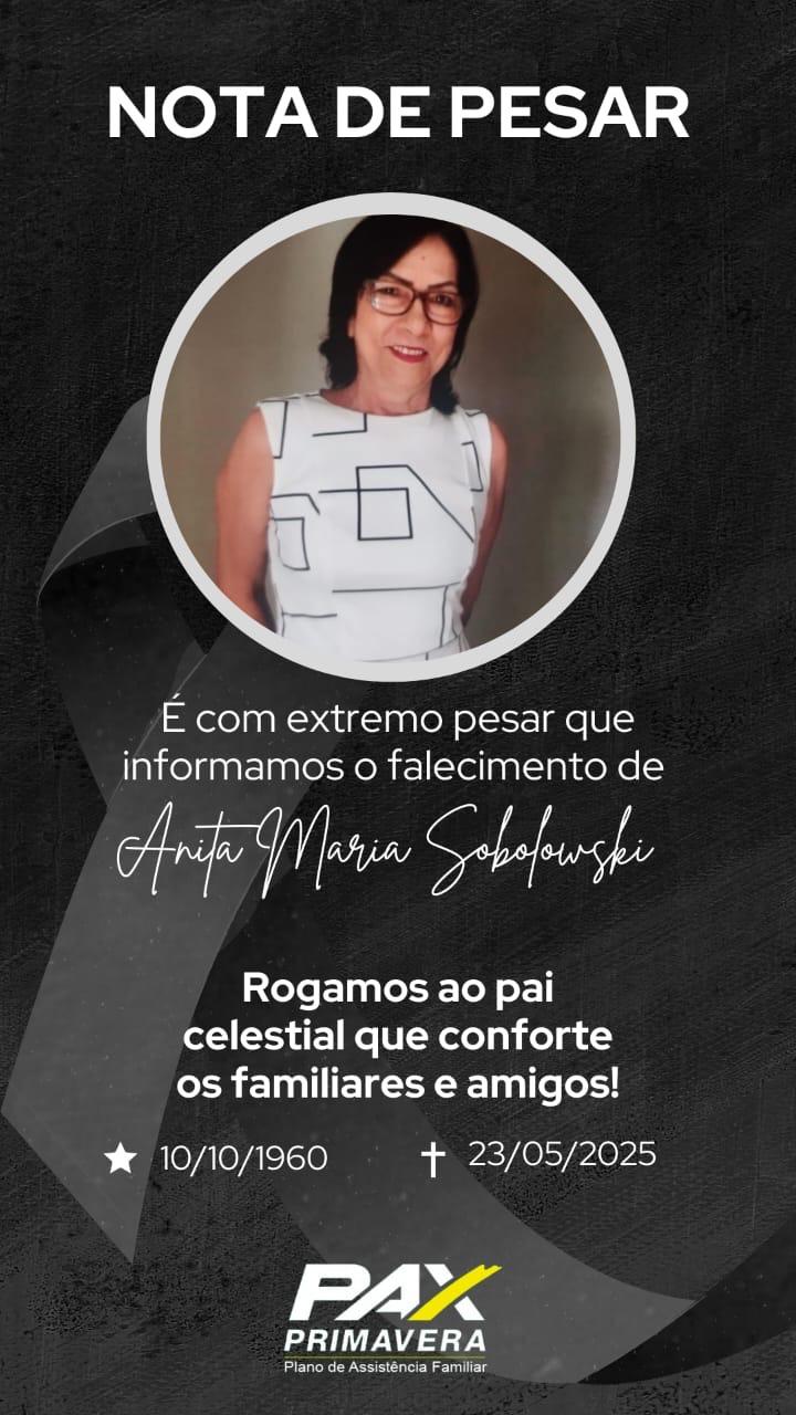 A funerária Pax Primavera de Santa Helena, comunica com pesar o falecimento de Anita Maria Sokolowski, aos 64 anos de idade.