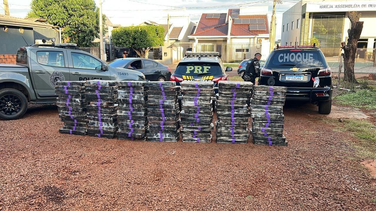 Após troca de informações entre a PMPR e a PRF (Polícia Rodoviária Federal) foi localizado um lava car utilizado como depósito de ilícitos. No local, equipes da Rotam, Choque e PRF apreenderam 1.004,8 tonelada de maconha.