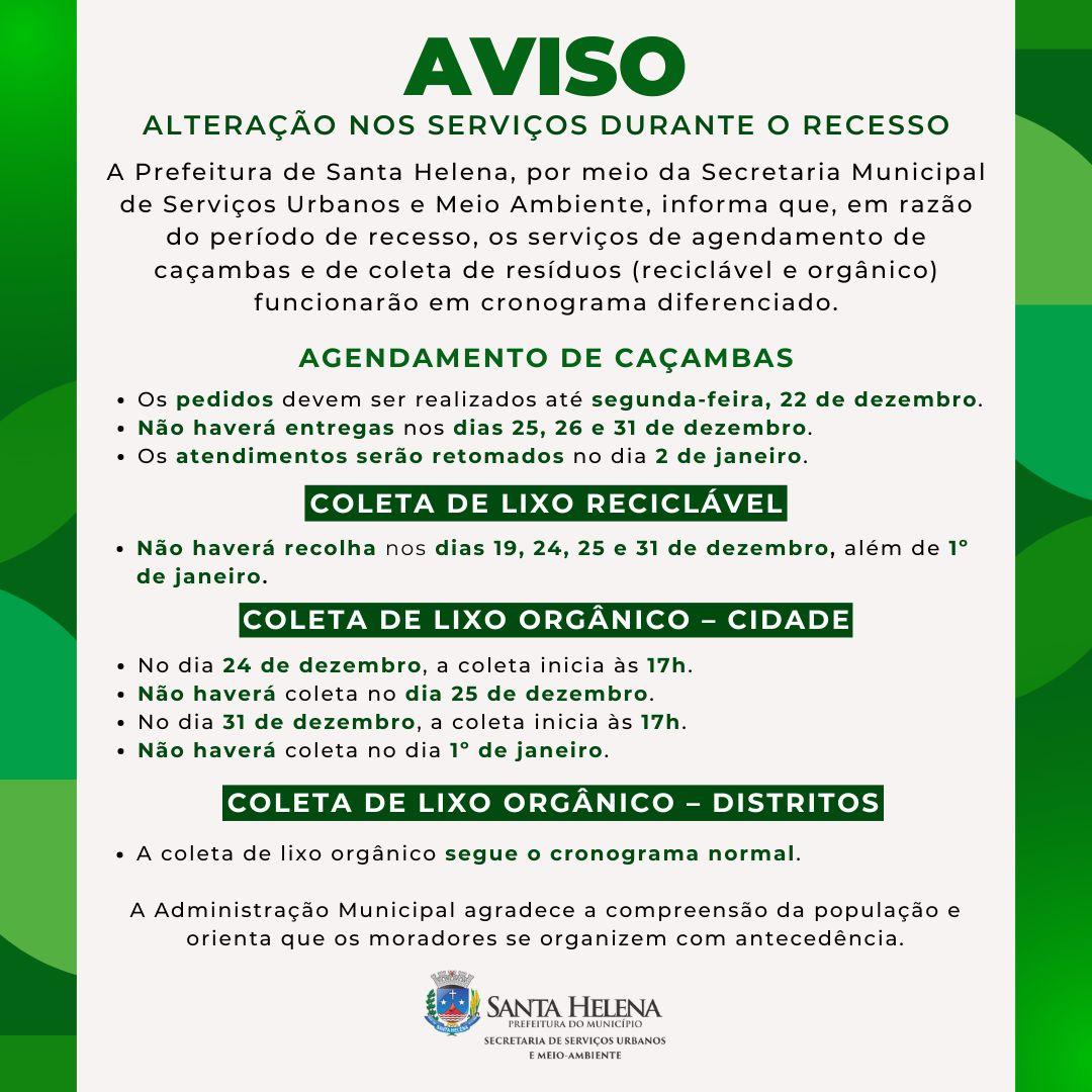 A Prefeitura de Santa Helena, por meio da Secretaria Municipal de Serviços Urbanos e Meio Ambiente, informa que, em razão do período de recesso de fim de ano, os serviços de agendamento de caçambas e de coleta de resíduos recicláveis e orgânicos terão funcionamento em cronograma diferenciado.