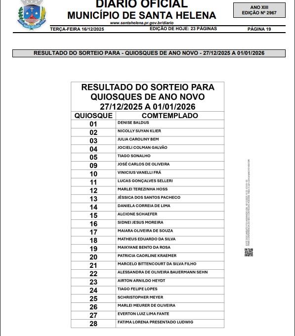 O sorteio foi realizado conforme previsto em edital e definiu os contemplados para a utilização dos quiosques no período de 27 de dezembro de 2025 a 1º de janeiro de 2026. Ao todo, foram sorteados 105 quiosques, distribuídos entre a Praia Nova e a Praia Velha, respeitando o percentual de reserva destinado aos moradores de Santa Helena.
