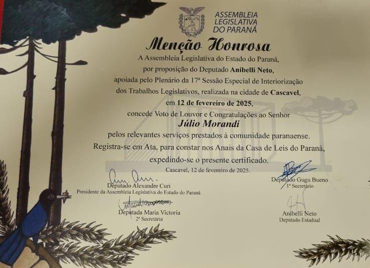 A homenagem foi prestada pela Assembleia Legislativa do Paraná ao ex-prefeito Júlio Morandi, em reconhecimento pelos serviços prestados à população de Santa Helena e do Oeste do Paraná. A entrega do Certificado de Honra ao Mérito ocorreu durante a Sessão Itinerante da Assembleia Legislativa em Cascavel, no dia 12 de fevereiro de 2025.
